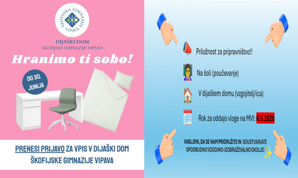 prisrčno vabljeni na informativni dan na Škofijski gimnaziji Vipava, ki bo potekal v petek, 13. februarja 2026, ob 9.00 in 15.00, ter v soboto, 14. februarja 2026, ob 9.00.